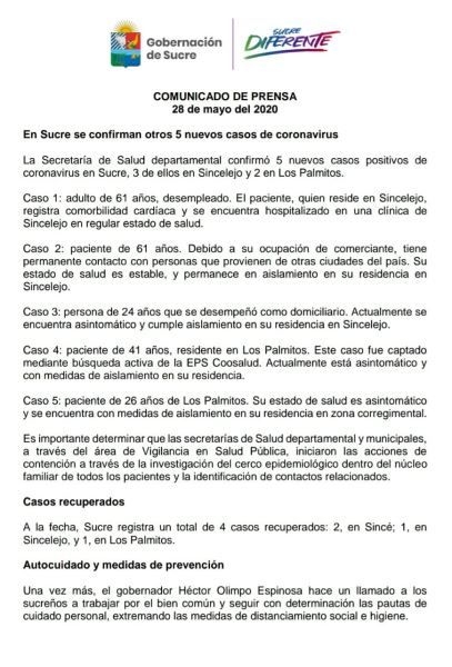 A la fecha, Sucre registra un total de 4 casos recuperados: 2, en Sincé; 1, en Sincelejo, y 1, en Los Palmitos.