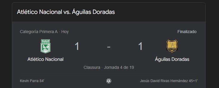 Con este resultado, Águilas Doradas acumuló 4 puntos y cayó a la casilla 15, mientras que Atlético Nacional, frustró su meta de ganar para tomar la punta de la tabla de posiciones.