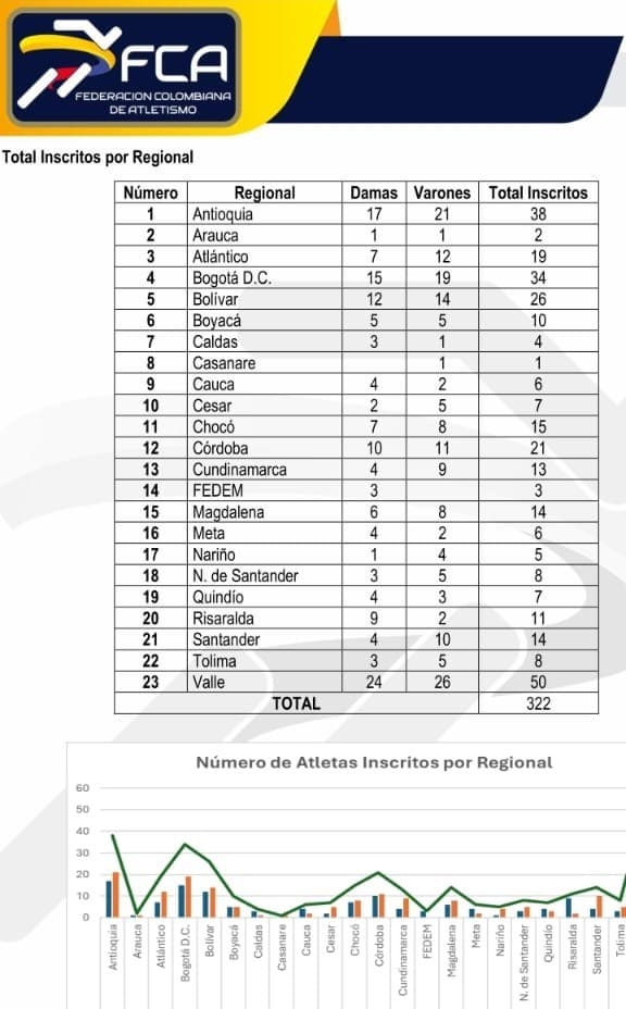 Los Primeros Juegos Nacionales Juveniles contarán con la participación de 322 atletas de diferentes regiones de Colombia, con Antioquia, Bogotá y Córdoba liderando las delegaciones más numerosas. Lamentablemente, el departamento de Sucre no estará presente.