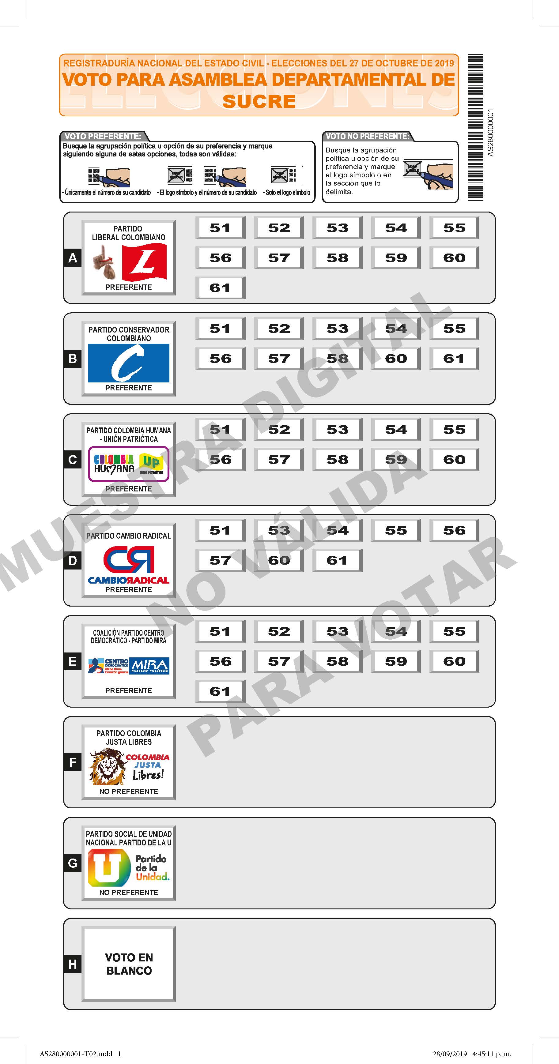 Este domingo 27 de octubre de 2019 se realizarán las elecciones a la Asamblea de Sucre y en esta oportunidad la tarjeta electoral de la Registraduría Nacional del Estado Civil, quedó oficialmente así: