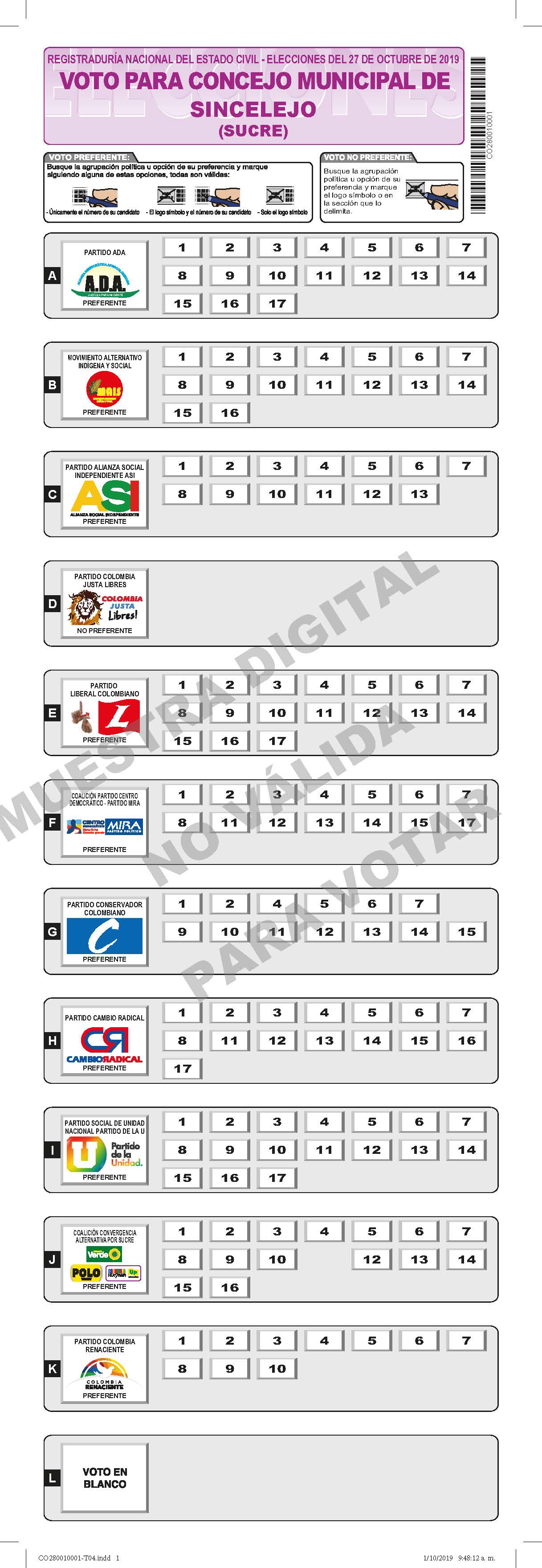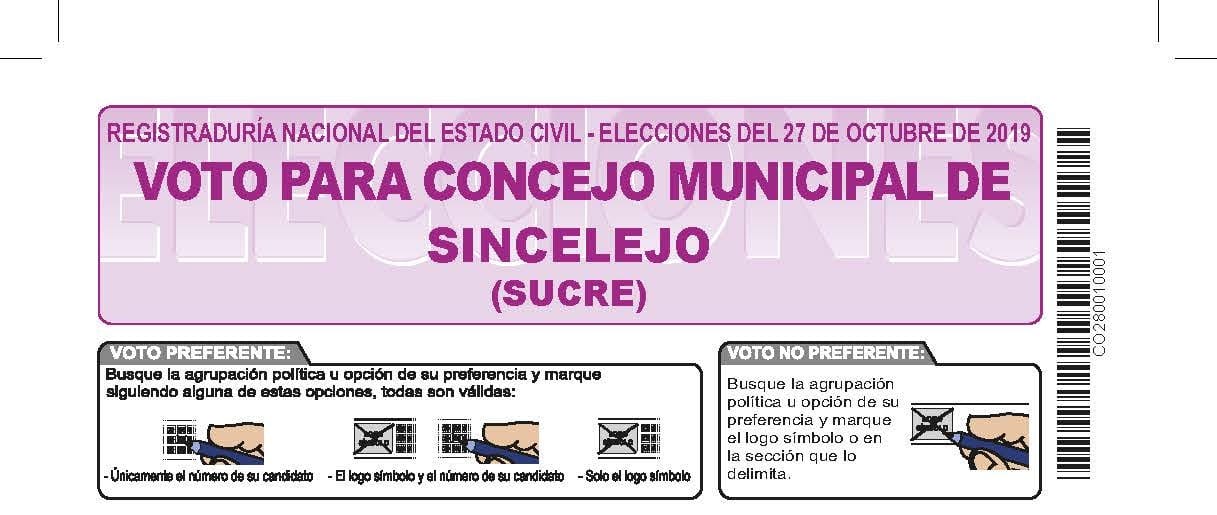 Este domingo 27 de octubre de 2019 se realizarán las elecciones al concejo de Sincelejo y en esta oportunidad la tarjeta electoral de la Registraduría Nacional del Estado Civil,quedó oficialmente así: