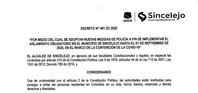 Now Reading: Conozca el decreto 481 que establece nuevas medidas para el mes de agosto en Sincelejo