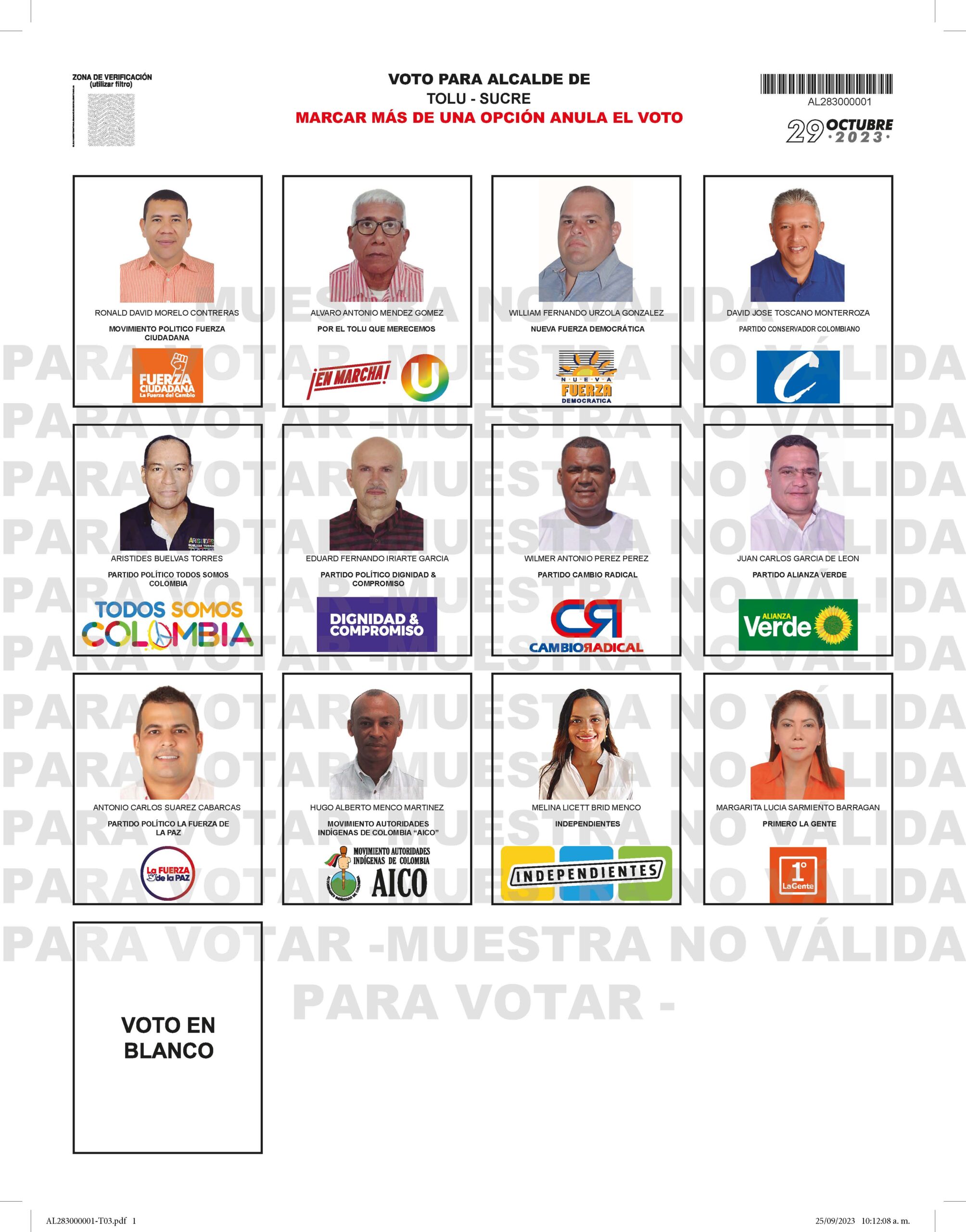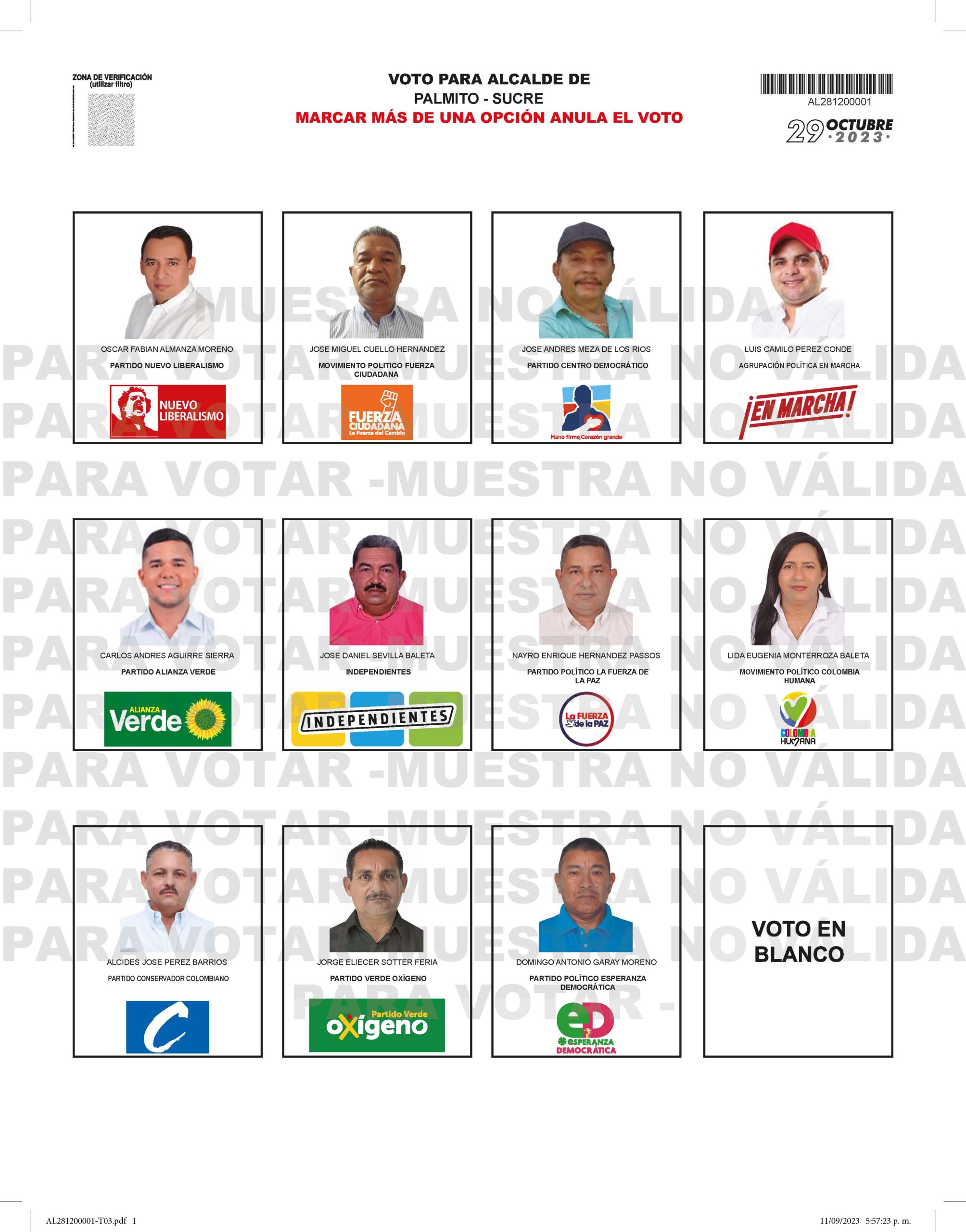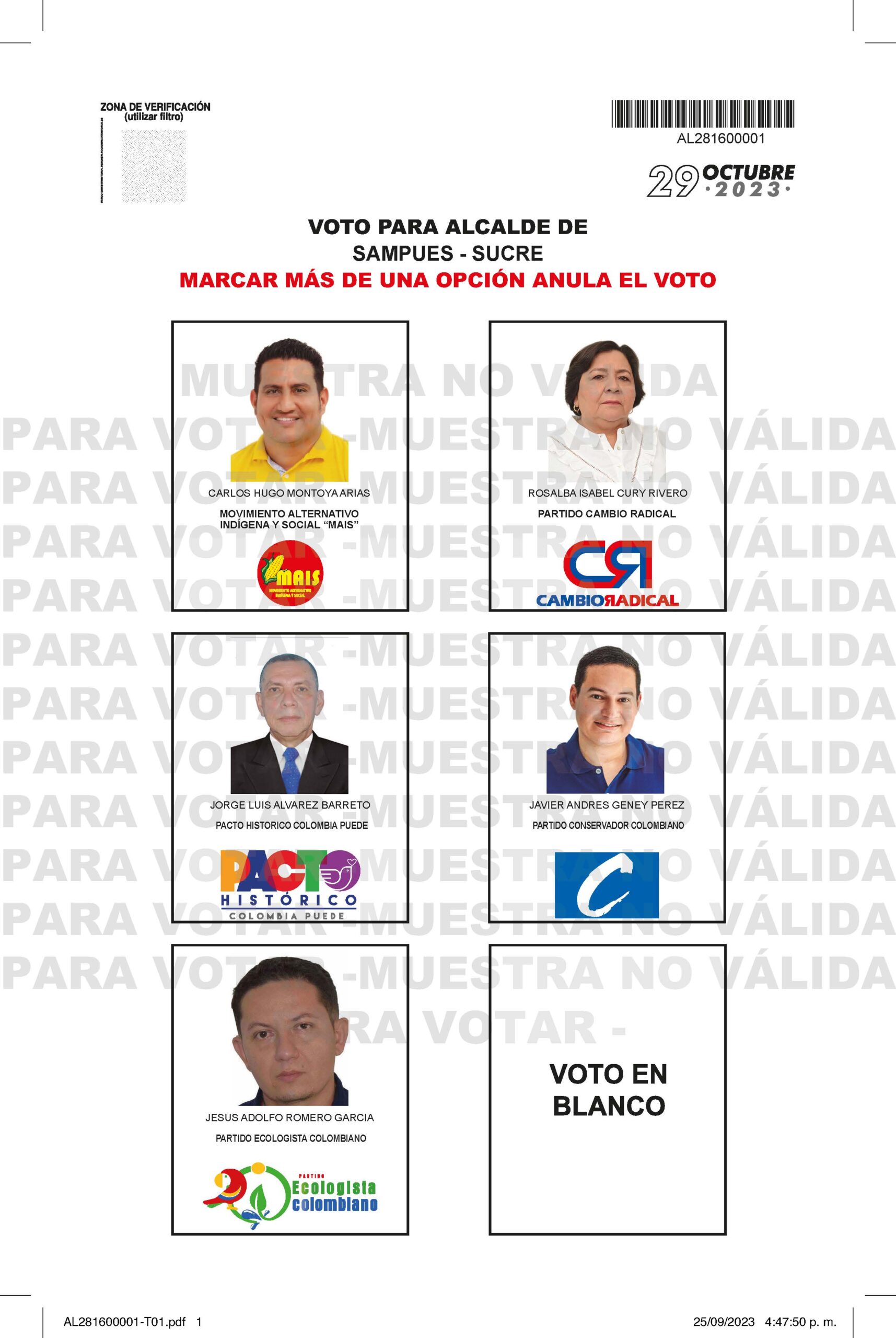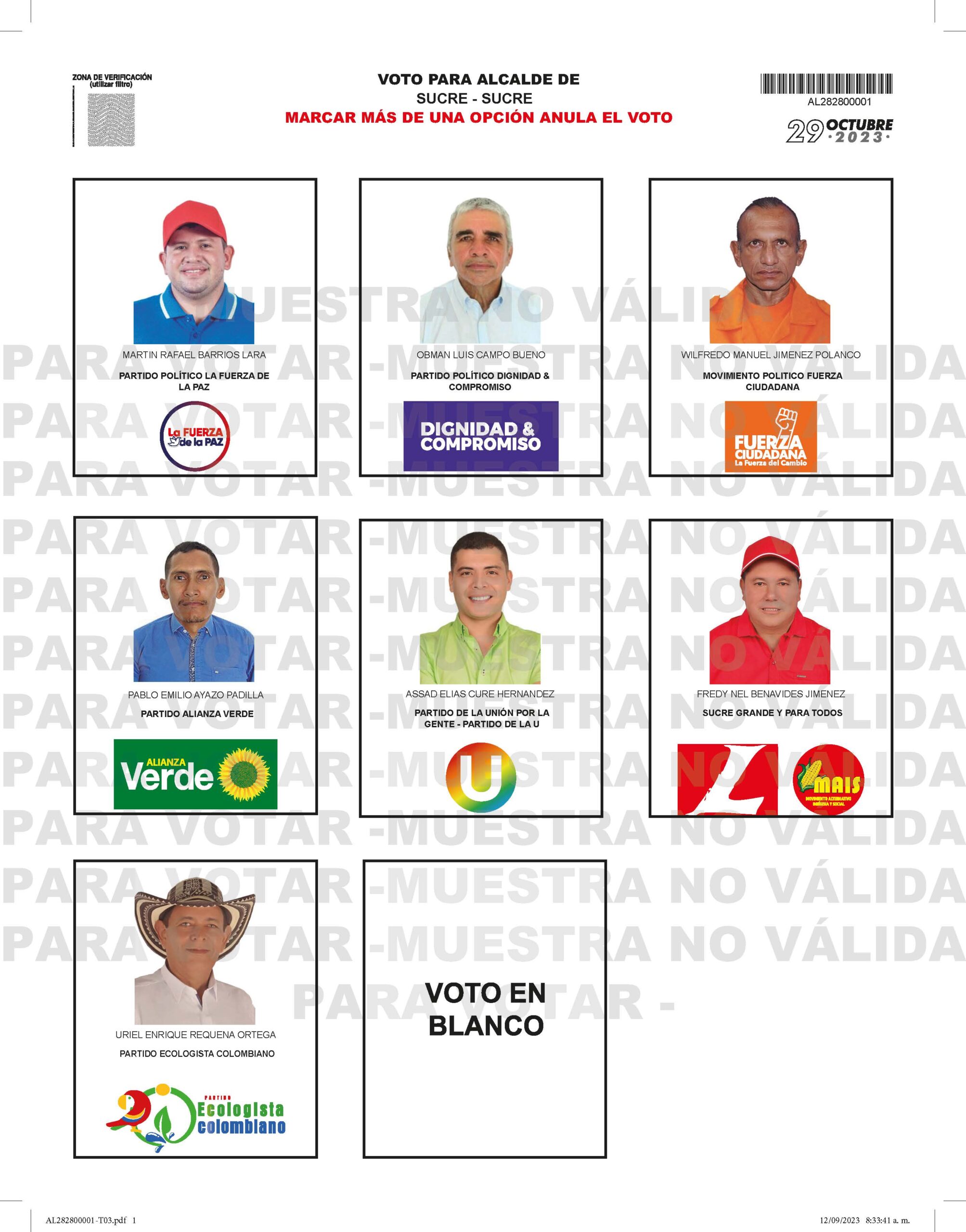 La entidad informó que hasta el pasado 8 de septiembre se dio trámite a las renuncias de candidatos, para excluirlos de estos instrumentos de votación y presentó el formato final de dichos documentos, resultando así los correspondientes a las alcaldías de los diferentes municipios del departamento de Sucre: