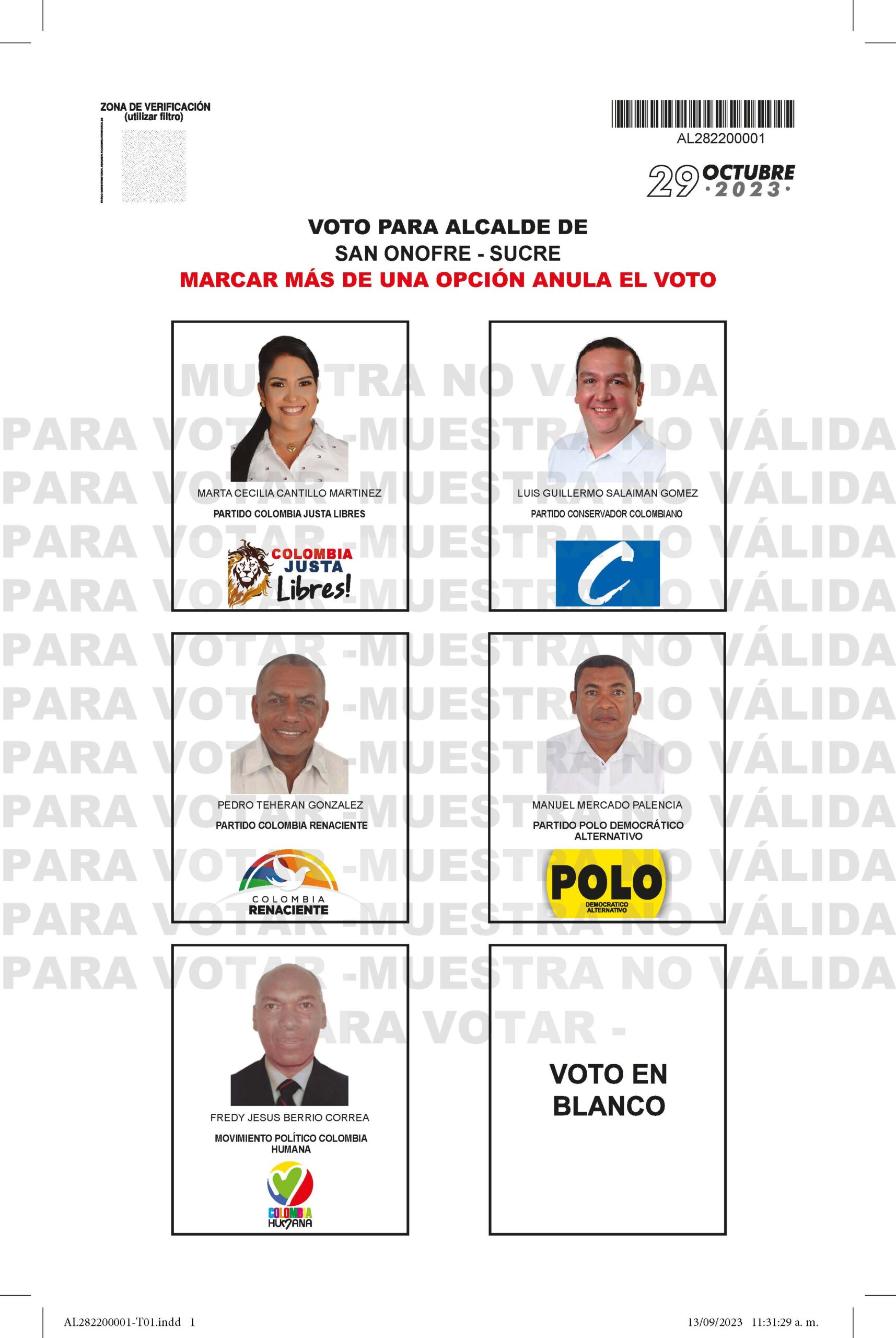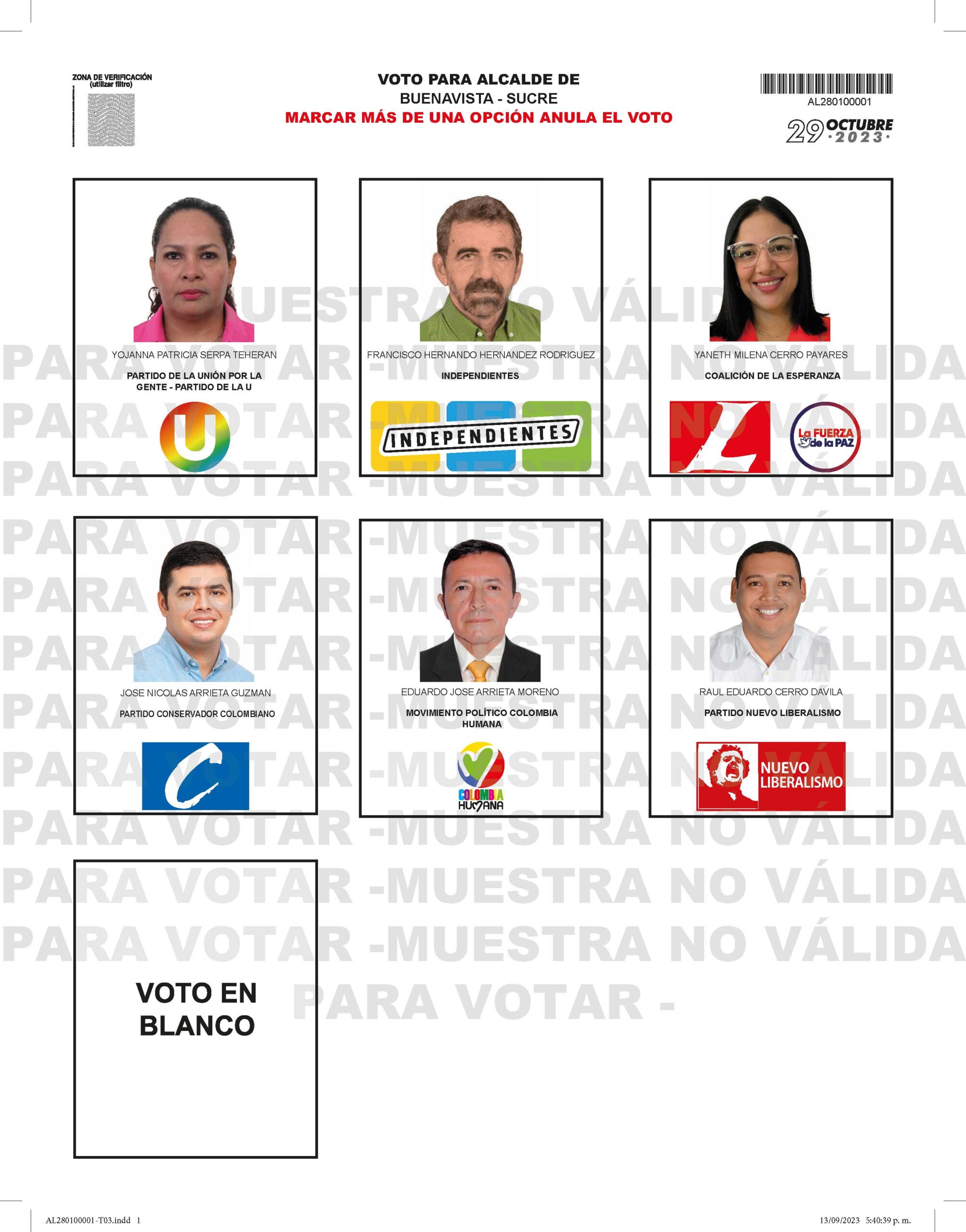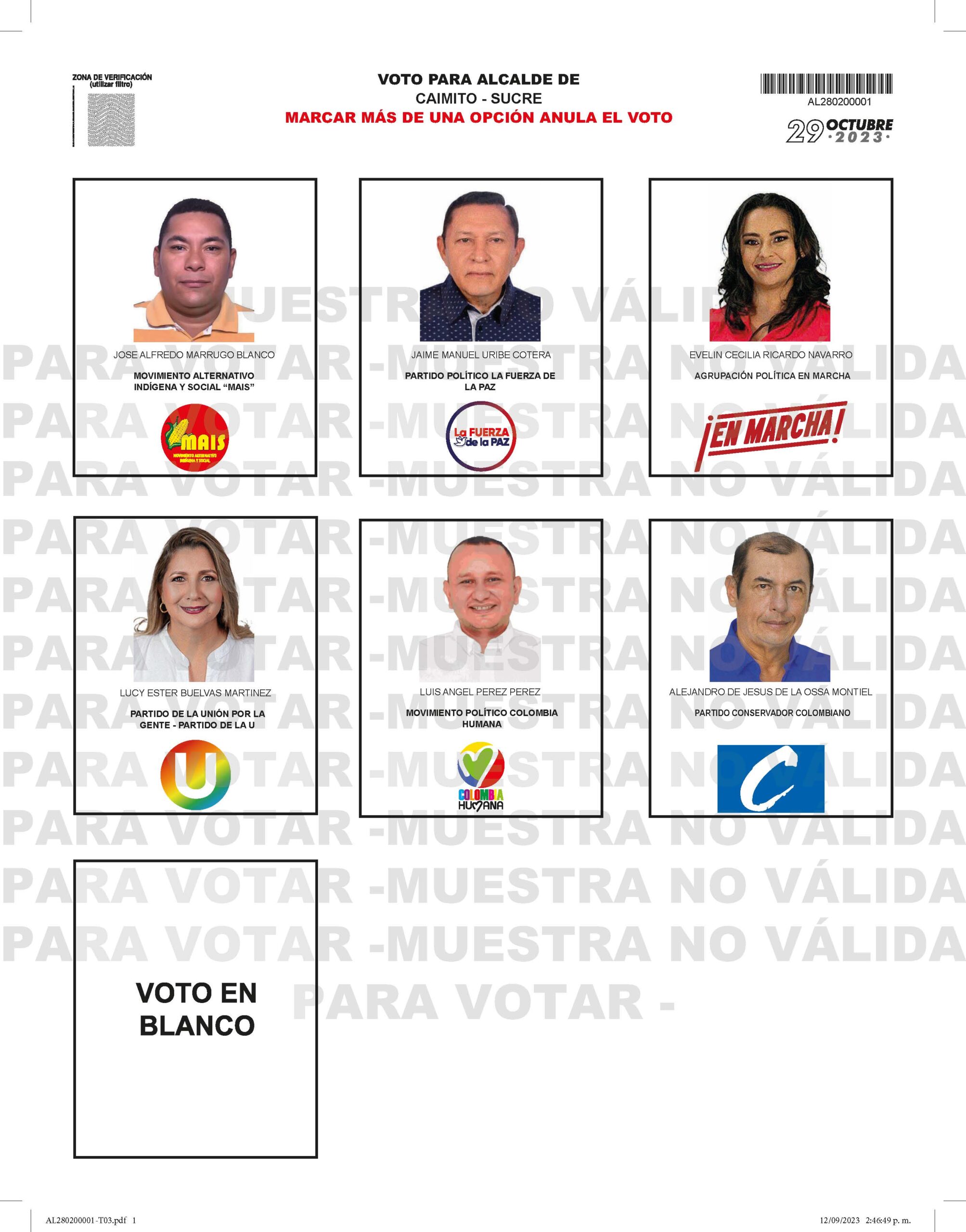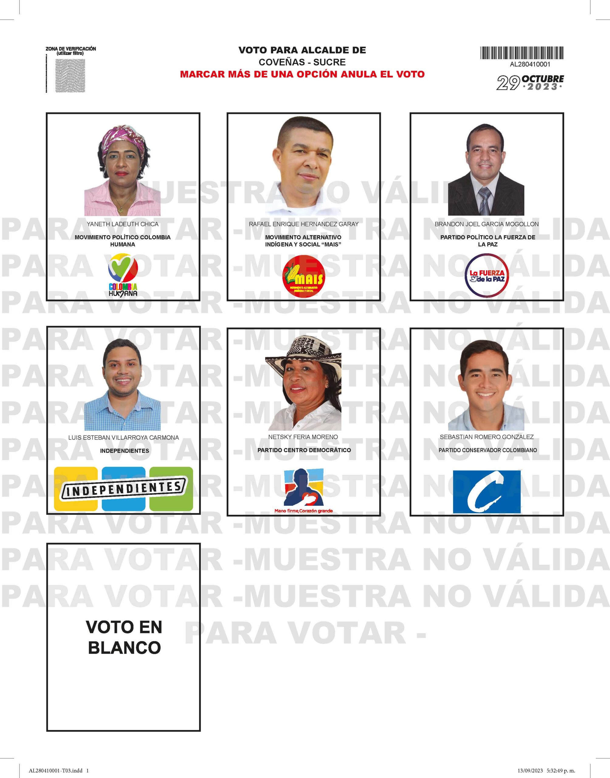 La entidad informó que hasta el pasado 8 de septiembre se dio trámite a las renuncias de candidatos, para excluirlos de estos instrumentos de votación y presentó el formato final de dichos documentos, resultando así los correspondientes a las alcaldías de los diferentes municipios del departamento de Sucre: