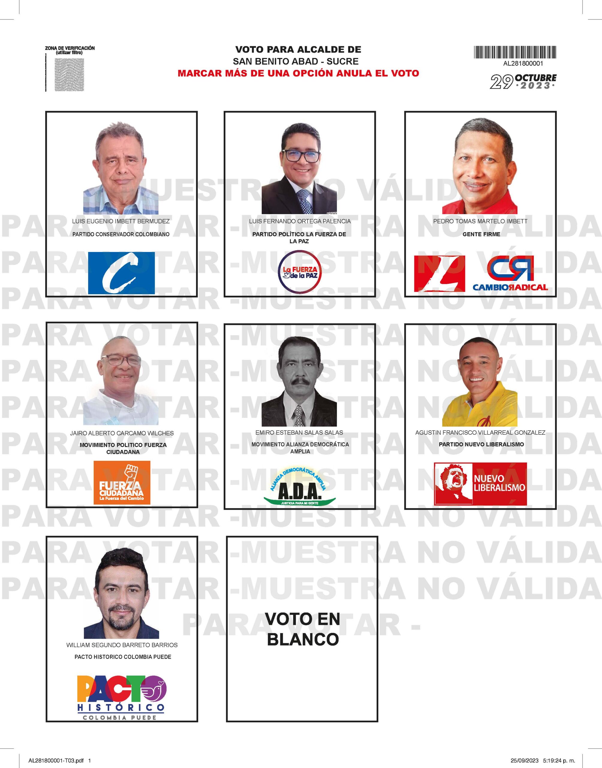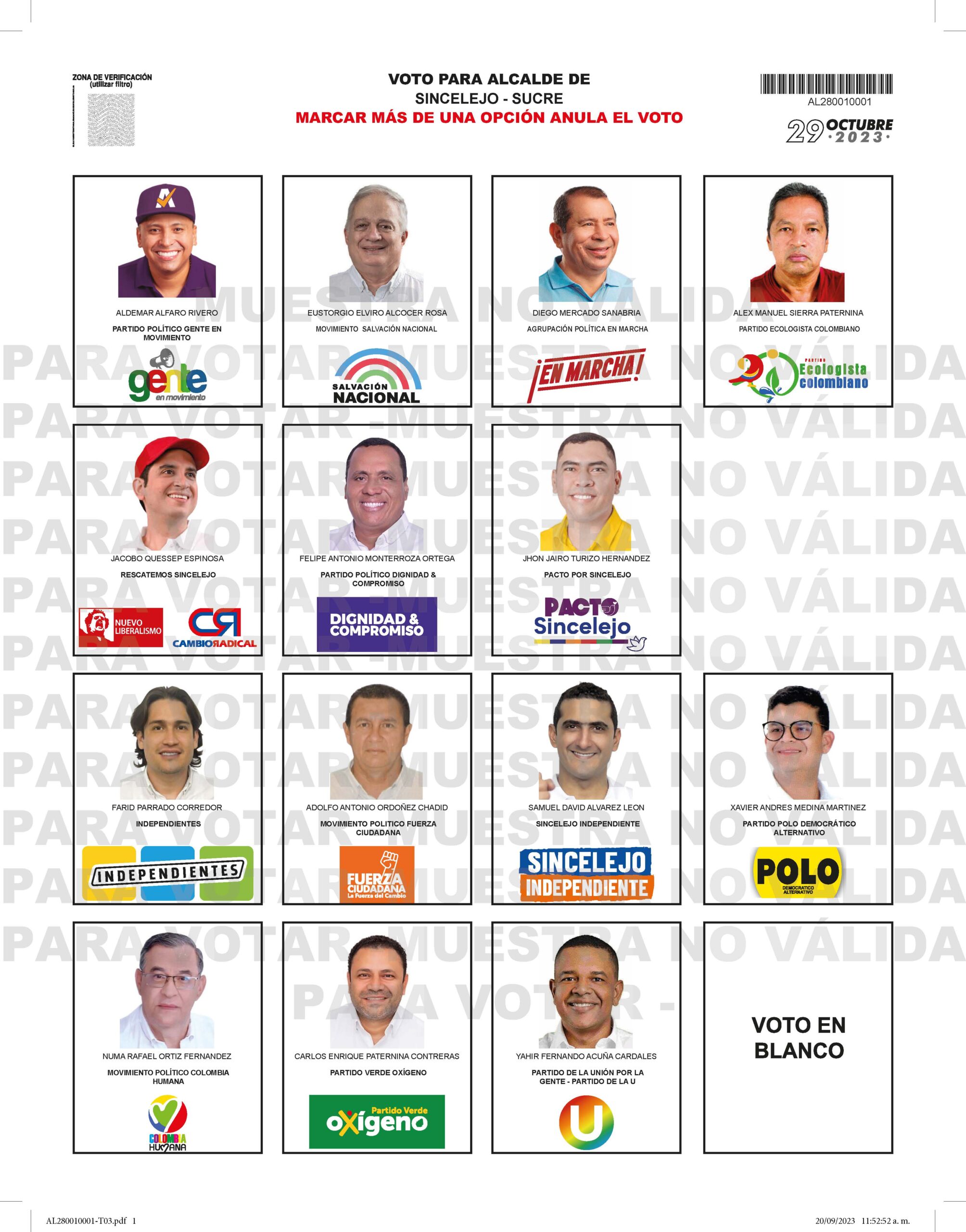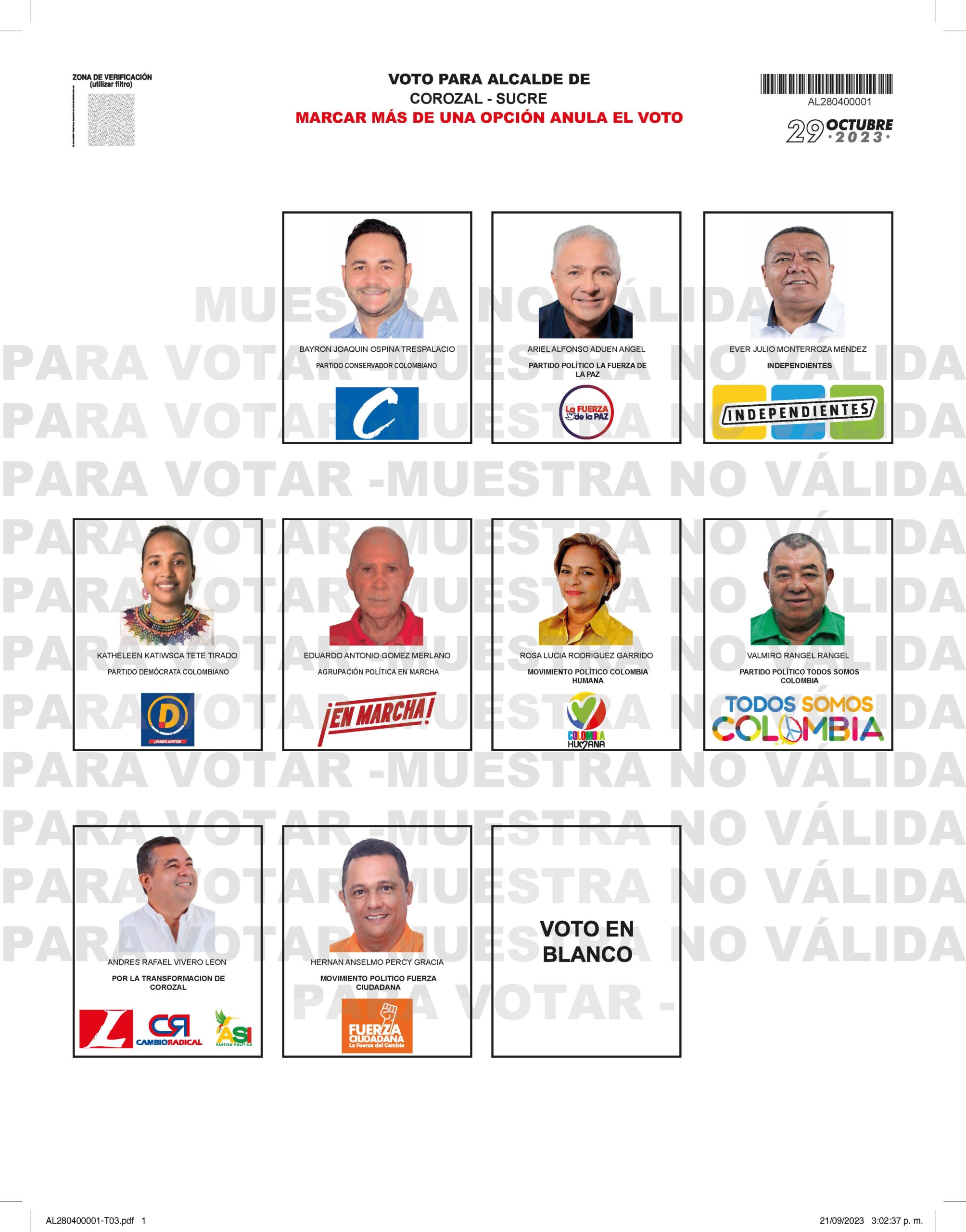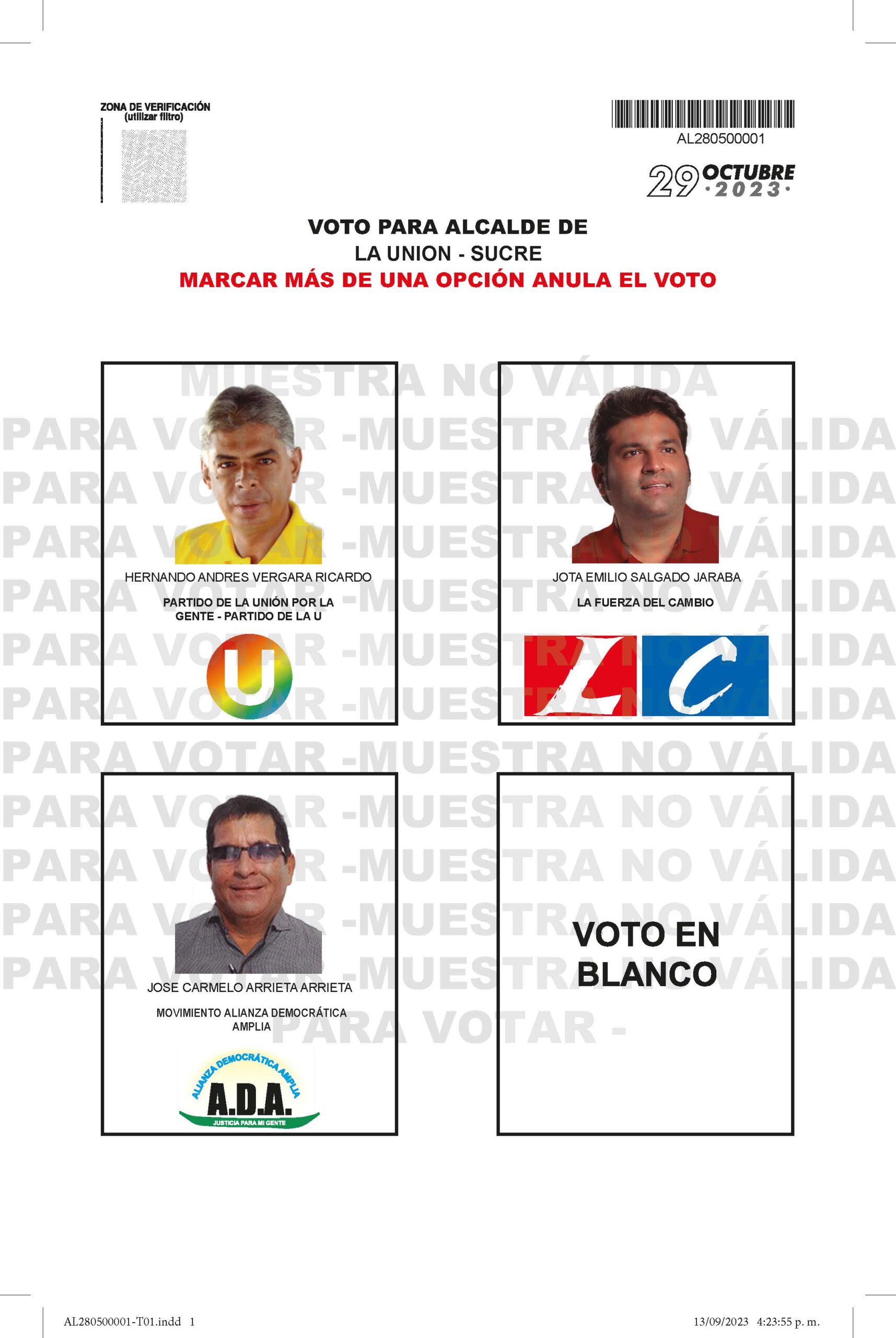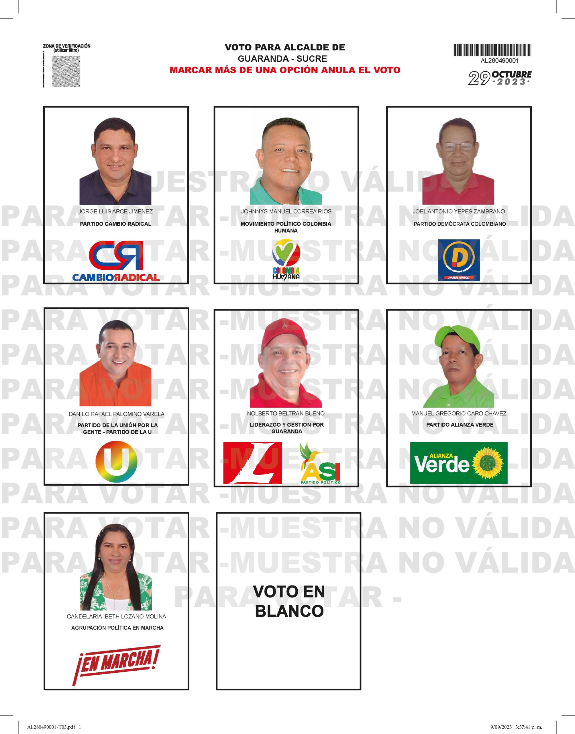 La entidad informó que hasta el pasado 8 de septiembre se dio trámite a las renuncias de candidatos, para excluirlos de estos instrumentos de votación y presentó el formato final de dichos documentos, resultando así los correspondientes a las alcaldías de los diferentes municipios del departamento de Sucre: