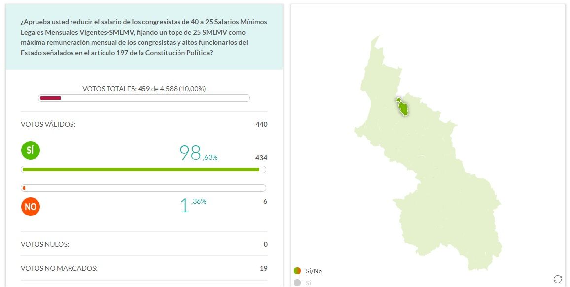 A la Consulta Anticorrupción le faltaron alrededor de 500.000 votos para ser válido. La meta era 12.140.342 de votos y alcanzó 11.665.890. Esto quiere decir que, a pesar de la alta participación que registró —recibió más votos que el actual presidente, Iván Duque, en la segunda vuelta—, sus mandatos no serán reglamentados ni convertidos en leyes de la República, aunque en cada uno el «Sí» haya superado el 99 %.