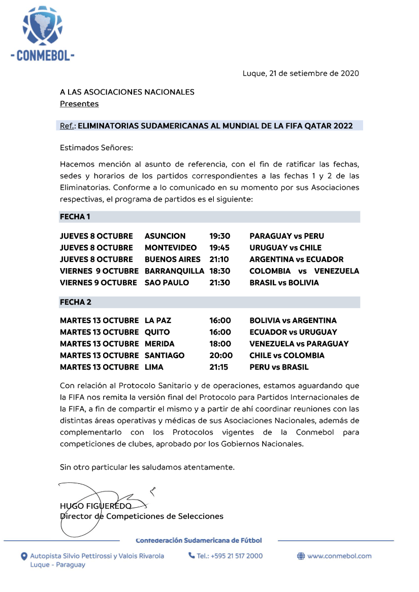 La Conmebol fijó las fechas y horarios de las primeras dos fechas de la eliminatoria sudamericana para el mundial de Qatar 2022, que arrancará en octubre tras postergarse dos veces desde marzo por la pandemia de coronavirus.