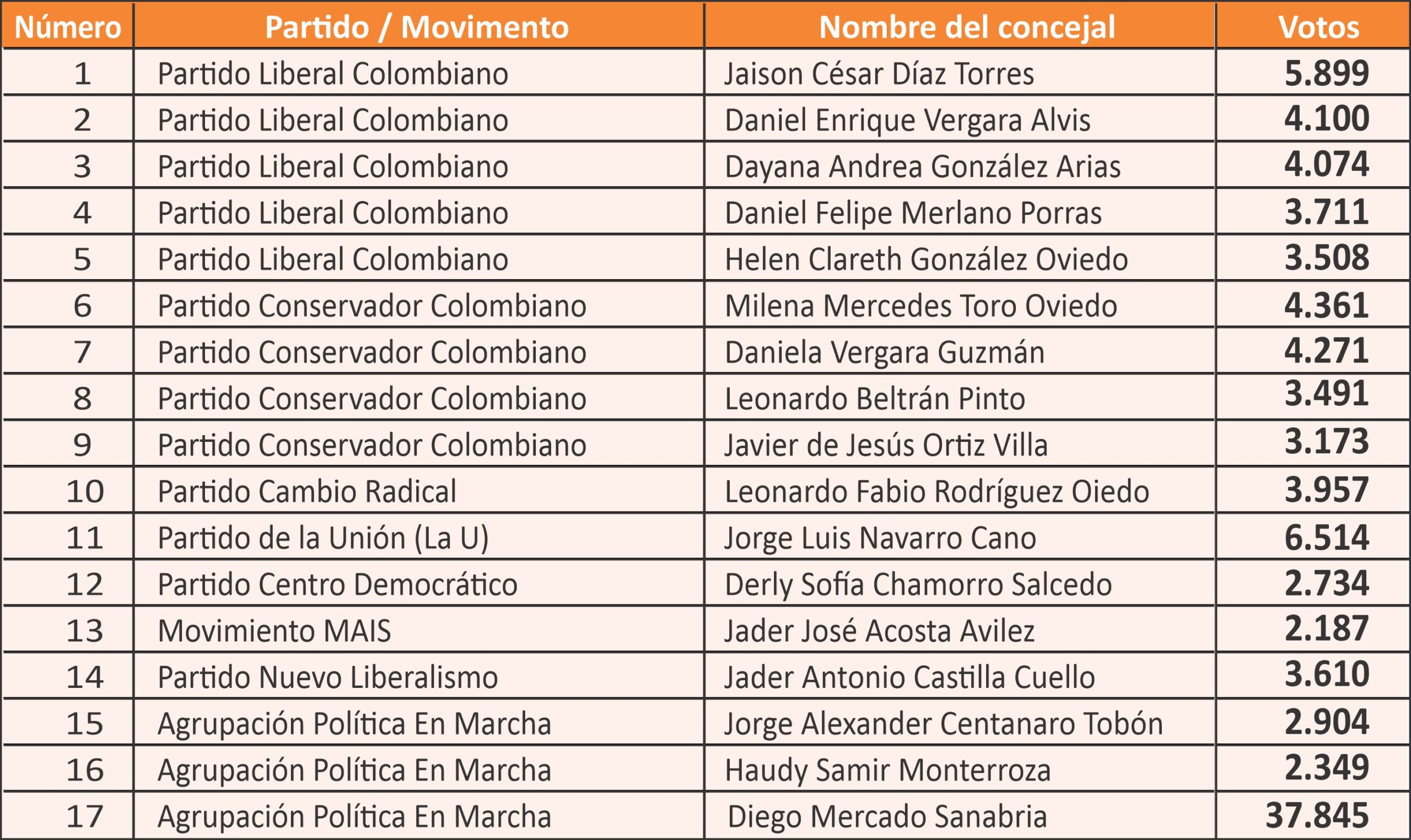 El Partido Conservador Colombiano logró 4 curules: Milena Mercedes Toro Oviedo, Daniela Vergara Guzmán, Leonardo Beltrán y Javier Ortiz Villa.