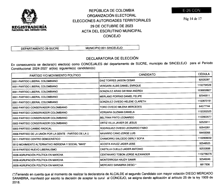 Tras finalizar los escrutinios de las mesas del municipio de Sincelejo, la Registraduría declaró electo de manera oficial, el nuevo Concejo de Sincelejo para la vigencia 2024 – 2027:
