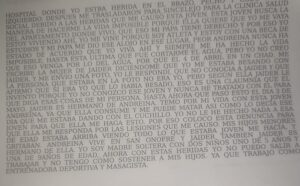 Sentí el primer cuchillazo en el pecho. Luego otro en el hombro. El último fue en el codo. Yo trataba de defenderme, forcejeaba, buscaba quitarle el cuchillo. Jaider me sujetaba y le decía a ella: