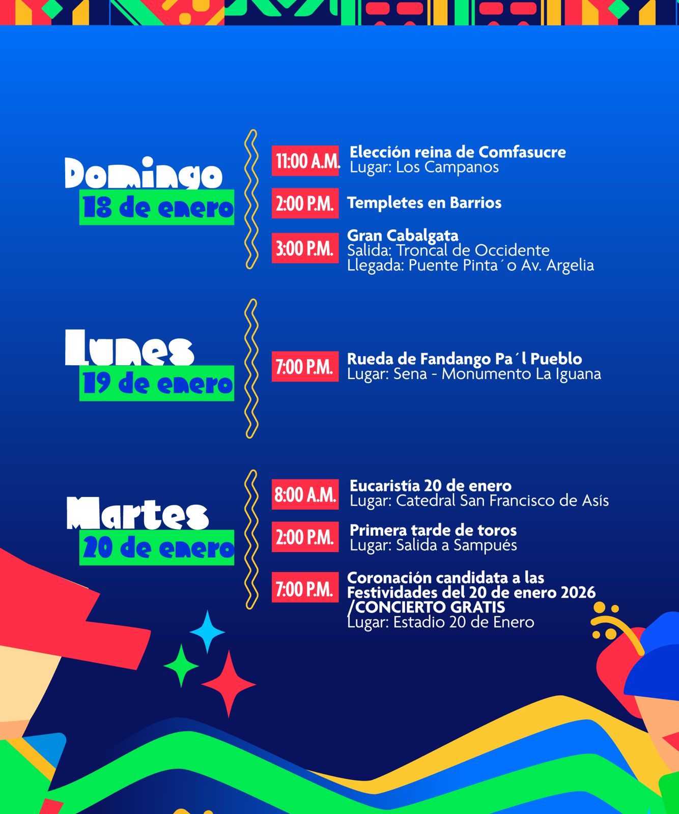 Conoce la programación oficial de la Fiestas del 20 de enero 2026 en Sincelejo, incluyendo conciertos, desfiles, bailes y el reinado del fandango.