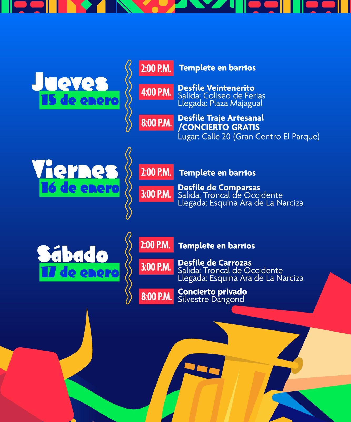 - 4:00 P.M. – Desfile Veintenerito / Salida: Coliseo de Ferias / Llegada: Plaza Majagual