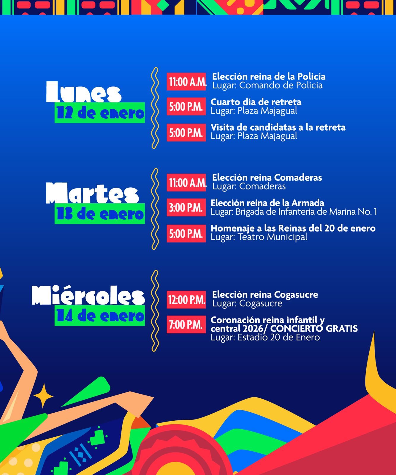 - 7:00 P.M. – Coronación reina infantil y central 2026 / CONCIERTO GRATIS. Lugar: Estadio 20 de Enero