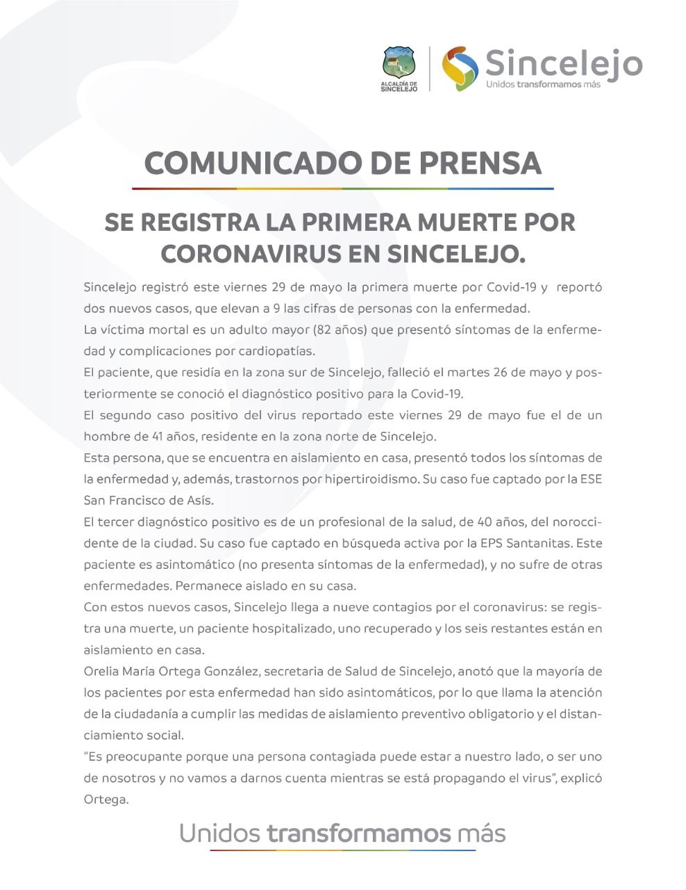 Sincelejo registró este viernes 29 de mayo la primera muerte por Covid-19 y reportó dos nuevos casos, que elevan a 9 las cifras de personas con la enfermedad.