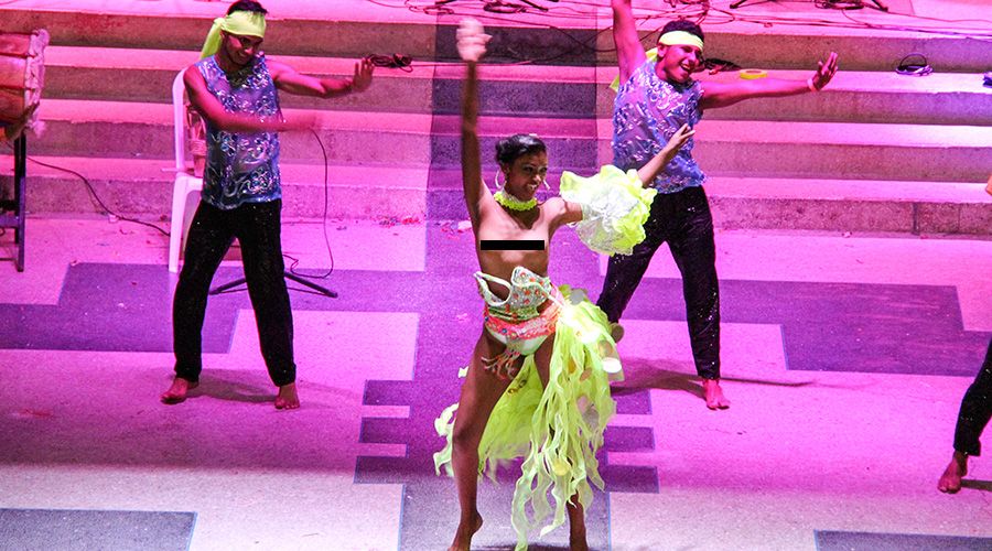 La reina estaba haciendo uso de los 7 minutos que los organizadores le dieron para ejecutar su rutina de baile cuando de repente, en el centro de la pista, se desprendió de su cuerpo la tiranta que sostenía la parte superior de su traje.