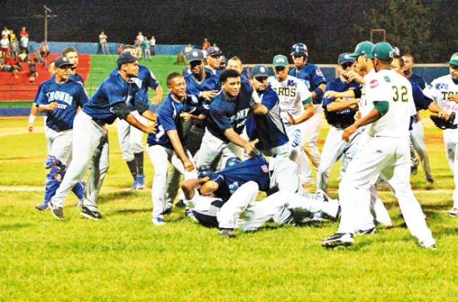El lanzador Wilder Aguirre, de Toros, golpeó con un mal lanzamiento a Andy Vásquez, que estaba en turno al bate. El jugador de Leones se fue caminando a primera base y en la marcha le recriminó al serpentinero, que no se quedó callado y respondió. De la labia pasaron a los hechos y se enfrascaron en una pelea que motivó a los jugadores de ambos equipos a salir al terreno de juego. Se armó la de troya.